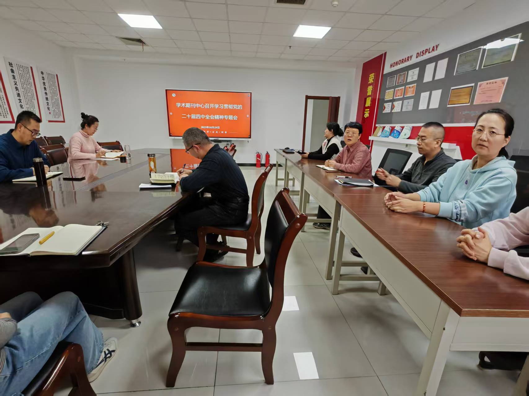 10月29日,学术期刊中心召开学习贯彻党的二十届四中全会精神专题会议,传达学习党的二十届四中全会精神,研究贯彻落实举措。中心全体人员参加,会议由中心直属党支部书记、主任奥海玮主持。