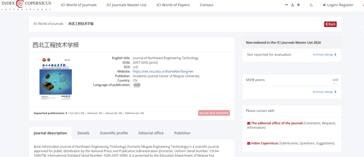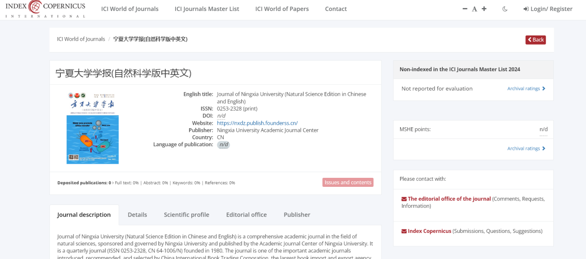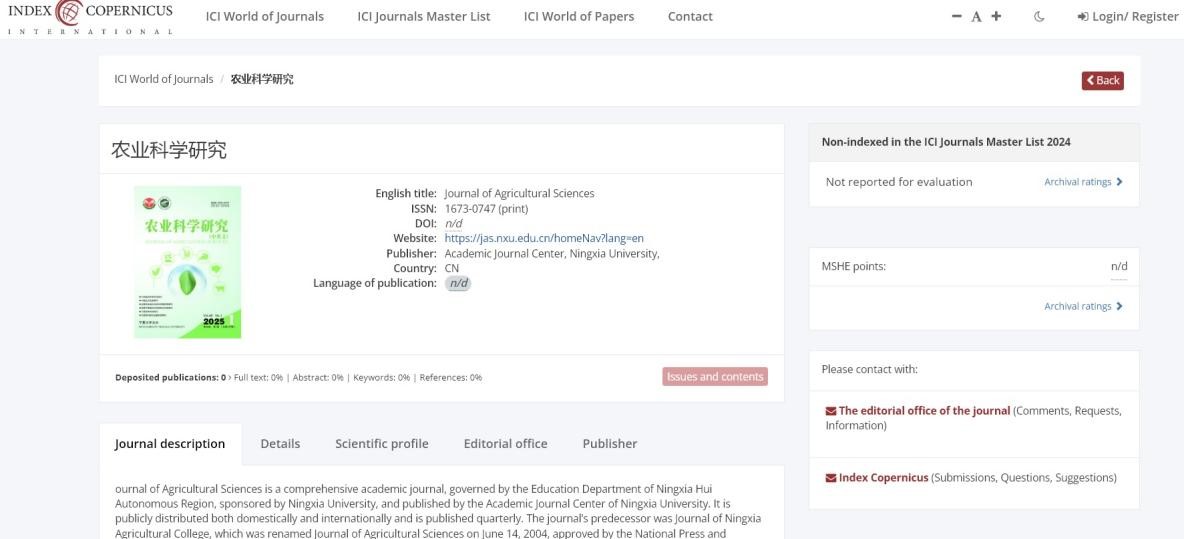 近日,由宁夏大学主办的《宁夏大学学报(自然科学版中英文)》《西北工程技术学报(中英文)》《农业科学研究(中英文)》期刊,正式被ICI World of Journals(波兰哥白尼期刊数据库)收录。此次入选,标志着三种期刊的学术质量与国际影响力再次获得了国际重要检索系统的认可,是我校学术期刊走向国际化进程中的又一重要里程碑。