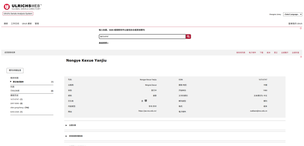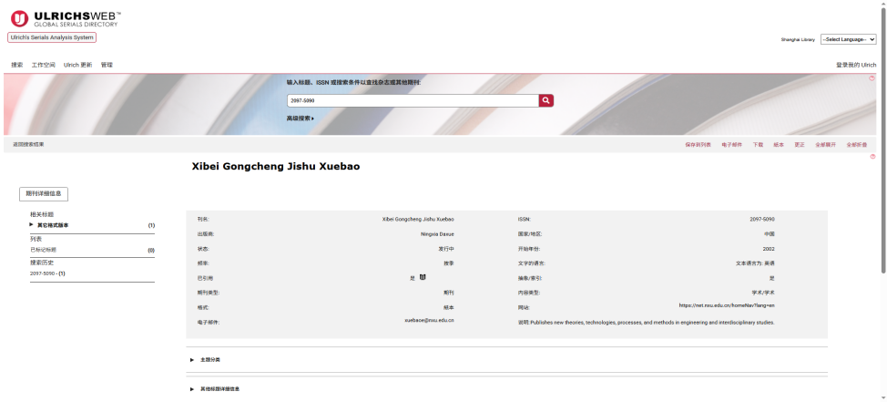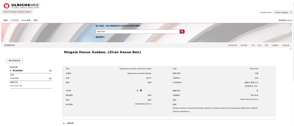 近日,由宁夏大学主办的《宁夏大学学报(自然科学版中英文)》《西北工程技术学报(中英文)》《农业科学研究(中英文)》期刊再传喜讯,正式被乌利希国际期刊指南(Ulrich's Periodicals Directory)数据库收录。这是继近期陆续被多个国际知名数据库收录之后,三种期刊在国际化进程中取得的又一重要进展,标志着刊物学术质量与影响力获得广泛认可。